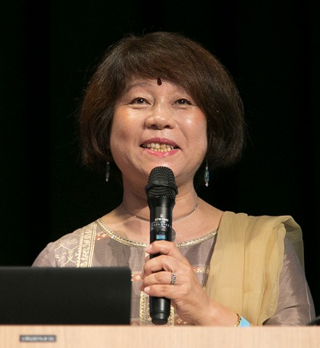Mr. MURAYAMA explained that Pandavani is a performance in song of famous scenes from the Indian national epic, the Mahabharata. The art is centered in Chhattisgarh, India, and sung in Chhattisgarhi, a dialect of Hindi. It has been handed down as a folk performing art in India, similar to the Japanese Naniwa-bushi, he continued. He introduced the three-stringed tambura instrument played by Dr. Teejan Bai, revealing that three gods are said to reside within it, and that the instrument itself is used to present a variety of objects such as a bow, a club, and even a torn-off arm! As it is not a religious rite, it can be performed freely anywhere.