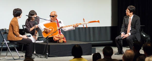 He began his talk by explaining the diversity of Cambodia, where 90% of the population is Khmer, but Vietnamese, Chinese, and 21 minority ethnic groups all live there. He explained that music is classified as either traditional, comprising court music, folk music and religious music, or popular music imported from the West. Court music is, as the name suggests, music that developed in the royal court and includes dance, shadow puppetry, and masked theater. Folk music consists of ceremonies for life and for the spirits. Master Kong Nay's recitations accompanied by music fall into this category. The audience listened intently to Professor Terada's descriptions of Cambodia's unique culture and customs and the instruments and sounds that accompany them. Professor Terada went on to talk about the days of the Pol Pot regime, when some two million Cambodians were massacred. He described the tragedy of 90% of the nation's musicians and dancers losing their lives and expressed his joy that Master Kong Nay miraculously survived those dark times and has continued to create music, commending his receipt of the Fukuoka Prize.