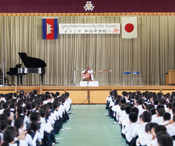 Prior to Master Kong Nay’s visit, the students of Wajiro Junior High School formed an Asia Week Executive Committee and organized “Asia Week” to learn about the history and culture of Asian nations. On the day of the visit, the entire school body assembled for an exchange forum, hosted by the Committee. When Master Kong Nay was introduced, the entire school body greeted him in unison in the Cambodian language, bringing a delighted smile to Master Kong Nay’s face.