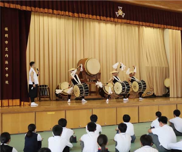 The visit to the school began with a row of taiko drums lined up on the school gymnasium stage. More than 300 third-year students gathered in the gymnasium to take part in Mr. Hayashi's lecture and performance. After sharing how he joined a taiko group at the age of 19 and how he became an independent taiko player, he talked about the history of taiko in Japan, and how the use of taiko has changed over time. Then Mr. Hayashi explained in plain language the characteristics of his own taiko music through demonstrations with four members of the EITETSU FU-UN no KAI.