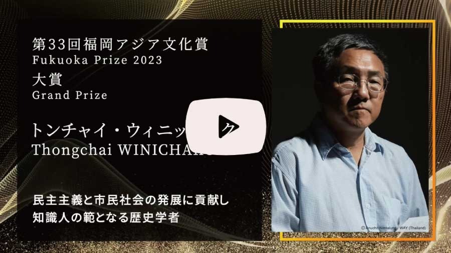 In recent years, he has published eight sole-authored books in Thai that discuss the history, current status and future of Thailand's monarchy and democracy, nation state and rule of law. Through these publications, he has played a pivotal role to lead and support the development of political awareness and activism among Thai students and citizens. His commitment to the progress of democracy and civil society, along with the originality of his activities at international level in academia make him a role model for Asian intellectuals. For such a contribution, Prof. Thongchai Winichakul is truly worthy of Grand Prize of Fukuoka Prize.