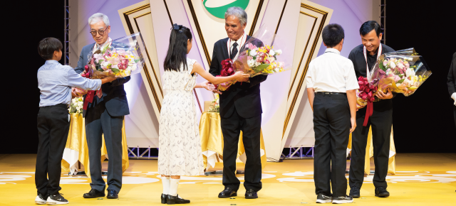 歴代受賞者を紹介するオープニング映像、司会の仲間由紀恵さんによる開会宣言とともに、華々しく幕を開けた第35回福岡アジア文化賞授賞式。秋篠宮皇嗣同妃両殿下ご臨席のもと、大賞の高良倉吉氏、学術研究賞のペク・ヨンソ氏、芸術・文化賞のヴォ・チョン・ギア氏と各界関係者、市民の皆さんが一同に介し、式がスタートしました。