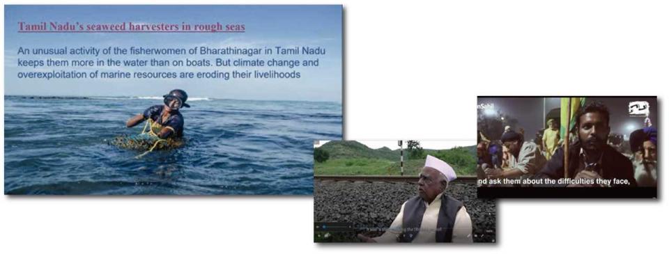 次に、サイナート氏の活動の拠点となるPARIの報道のあり方を、映像を交えながら紹介しました。地方の農民、労働者、漁業者、森にすむ人たち、芸術家など、普通に生活する人々と触れ合い、信頼を勝ち取り、生活に密着しながら草の根的な活動で人々の「日々の声」を拾い上げ、実体験を報道していく。その地道な取材方法を明らかにしました。映像では、素潜りで海藻を採る女性、気候変動で砂漠化が進む地域、自分たちでラジオ局を作って気候変動について学び・報道している漁民たち、コロナ禍で医療に従事する人々などを紹介。気候変動やパンデミックが引き起こしたインドの人々の現状を詳細に語りました。