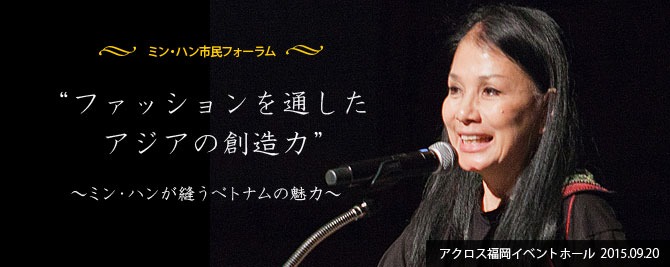 ベトナムのアオザイや少数民族の刺繍・織物と現代的なデザインを大胆に融合しながら、ドイモイ(刷新)以降のファッション産業界をリードし、世界中のファッションショーで独創的な作品を発信してきたミン・ハン氏。ベトナム戦争の記憶を越え縫い続けた自身の生き方を振り返り、アジアの創造力の結晶とも言えるファッション作品を披露いただきました。