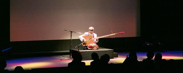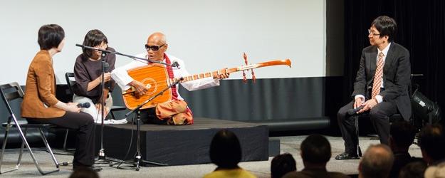 第2部はコン・ナイ氏のコンサートが行われました。最初は久保氏が解説した『リアムケー』の一節。コン・ナイ氏は王位を辞したリアムが宮廷から森へ去っていくシーンを朗々と歌い上げ、聴衆は韻を踏んだ詩とチャパイの素朴な音色に耳を澄ましていました。その後、結婚する娘を送り出す母親の気持ちを歌った『カット・カン・スラー』、視力を失ったコン・ナイ氏の境遇を詩にした『目の見えない者の人生』と続き、この曲は今回のために新しく作った歌だと紹介。最後は陽気に盛り上がる『ラムリアウ』に聴衆から手拍子が送られ、会場が一体となった楽しいステージとなりました。寺内氏は復興目覚ましいカンボジアの現況を話し、伝統音楽が若い人々に継承されて欲しいとの願いを込めてフォーラムを締めくくりました。