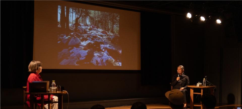 対談者に森美術館館長の片岡真実氏を迎え、キムスージャ氏の多様な作品に共通している「縫う、包む、解く」といった考え方に迫りました。会場となった福岡アジア美術館は、キャリアの初期作品『演繹的オブジェ』(1997)を日本で初めて所蔵。北九州市で滞在作家として活動していたことにも触れ、「福岡はいつも私の作品を理解しサポートしてくれるまち」と福岡との縁を紹介しました。