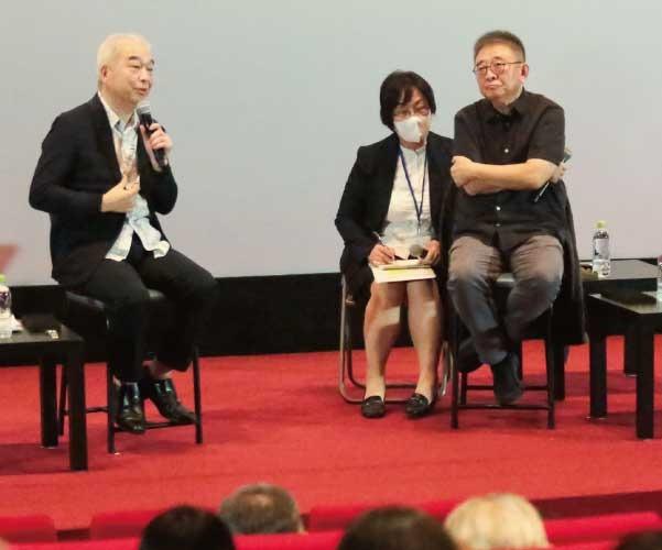 映画鑑賞をした観客に向けて、張氏から感謝の言葉が述べられた後、コーディネーターの石坂氏より張氏と福岡との縁が紹介されました。「アジアフォーカス・福岡国際映画祭」の参加をきっかけに2007年からほぼ毎年福岡に訪れるようになった張氏。映画祭では、これまでに7本の作品が上映されました。また、福岡との交流が深まる中でアイデアが膨らみ、福岡三部作が誕生。制作過程で多くの市民や県民が関わり、映画を通して交流を深めてきました。