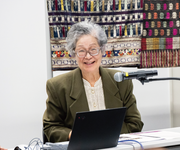 ラオスの古典文学と伝統織物を研究し、その保存と普及に大きく貢献してきたドアンドゥアン・ブンニャウォン氏。冒頭、ラオスの伝統織物に繰り返し登場するナーガ(龍神)文様が2023年にユネスコの無形文化遺産として登録されたことに触れ、「ラオスにとって大変光栄です」と笑顔で述べました。