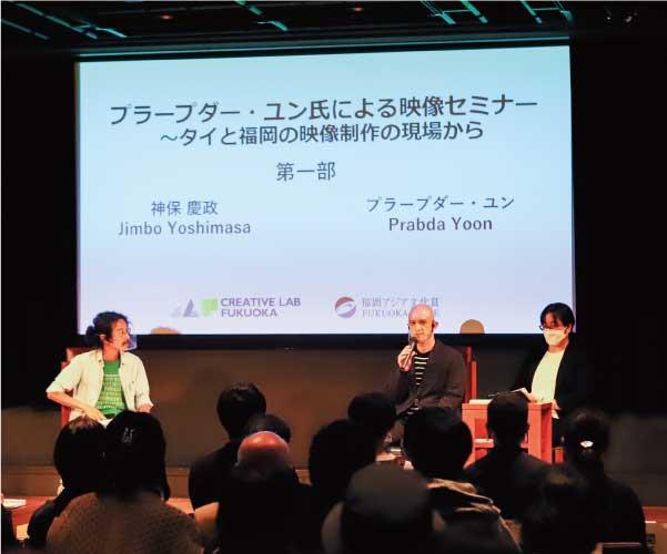 最後にプラープダー氏は福岡について「山も海もあり、都市生活と自然が近い特別な環境。ロケ地として多彩な魅力があり、世界的に見ても興味深い地域だと思う」と述べました。作品上映と対談を通して参加者が相互に刺激を受け、将来への広がりを感じる有意義なセミナーとなりました。