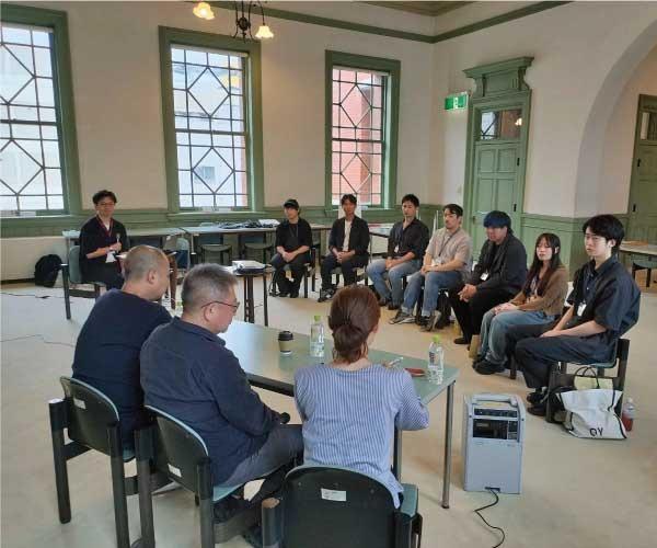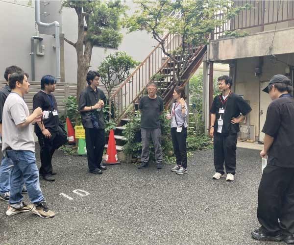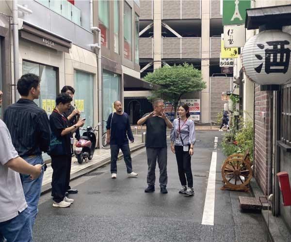 映画監督や映画プロデューサーを志望する若手クリエイター7名に向けて、1日限りの特別授業を行いました。張律氏による受講者作品・企画へのフィードバックの後、映画『福岡』のロケ地となった天神・中洲地区を巡り、その構図で撮るに至った経緯や、ロケハンの際に重視していたポイントなど映画制作の手法をレクチャーしました。