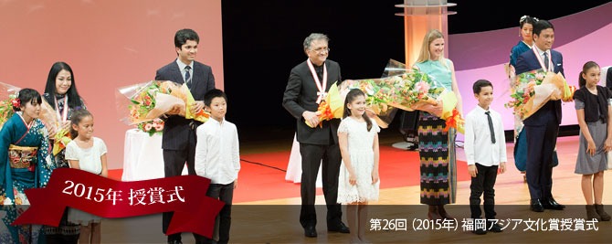 続いて、秋篠宮殿下よりお言葉を賜り、審査委員長の久保千春九州大学総長より選考経過が報告され、高島市長より受賞者に賞状とメダルが授与されました。市民を代表して大学生よりお祝いの言葉が贈られ、福岡インターナショナルスクールの可愛らしい子どもたちによって花束が贈呈されると、観客から大きな拍手が贈られました。