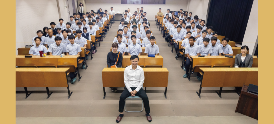 博多工業高校建築科の1年生から3年生、総勢120名が待つ教室に、ギア氏は招かれました。開始早々、「まずは一緒に瞑想をしましょう」との呼びかけこの日を楽しみにしていた生徒の皆さんは、いくぶん戸惑いながらも、次第にリラックスした雰囲気に変化していきました。