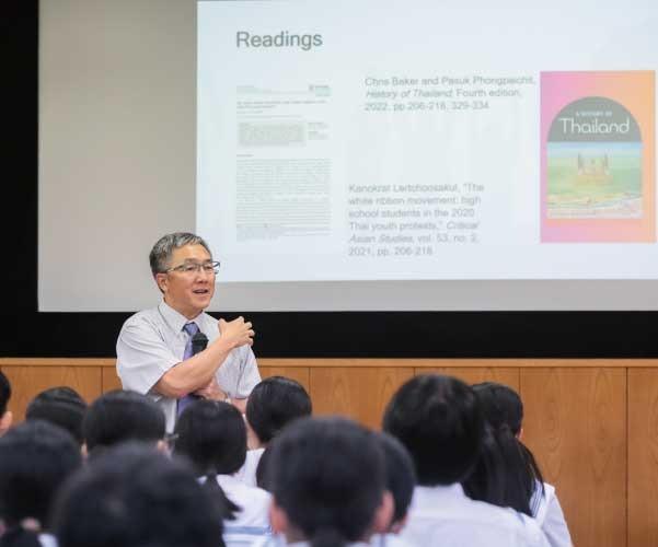 後半では、トンチャイ氏が「なぜ最近になって運動が起こり、参加者が若年化したのか考えてほしい」と問いかけ、ディスカッションが行われました。「ソーシャルメディアの発展で、若者が情報を得て意見を交わせるようになった」という生徒の発言に対して、歴史学者の中でも同様の見解があると評価し、さらに様々な角度から「Why?」を追求し様々な考えが発表されました。