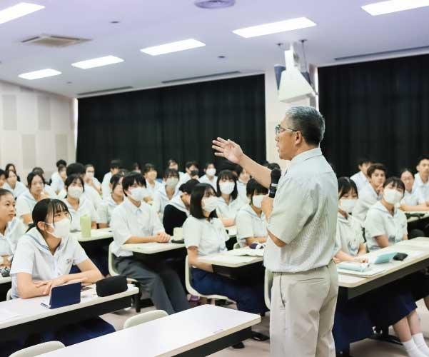英語学科の1、2年生に向けて、「タイにおける過去と現在の若者の社会運動」をテーマに講演をしたトンチャイ氏。民主化を求めて1973年から1976年にタイで起こった学生運動を中心に、軍事独裁政権に抑圧された激動の歴史が語られました。多数の若者が集まるデモの様子や、当時17歳だったトンチャイ氏の写真などをスライドで映し、運動に参加した自らの体験を交えて説明。その後も、国政が変化を繰り返してきた経緯や、10年ほど前から学校で言論や頭髪などの規制が厳しくなってきたことにも言及しました。そして、2020年から活発化した学生運動に焦点を当て、デモの参加者の多くが高校生であり、特に女子学生が増えている状況を伝えました。