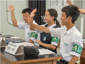 交流会第2 部では3 名の生徒代表と、「これからの福岡・アジア・世界をよりよい場所にするために何をすべきか」についてのディスカッション。はじめに生徒がちょっと緊張しながらも英語で自己紹介。続いて、1学期の授業で調べたこと考えたことを発表しました。サイナート氏からは「皆さんの感受性の素晴らしさに感動した。希望をもらった」とメッセージが送られるとともに、その気づきをどう次のステップにつなげていくかというアドバイスをもらい、有意義な時間となりました。
