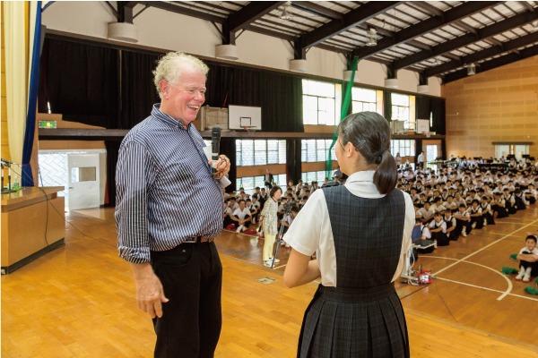 2019年、学術研究受賞のレオナルド・ブリュッセイ氏が、福岡市東区にある松崎中学校を訪問しました。