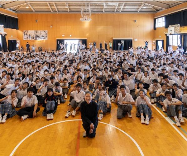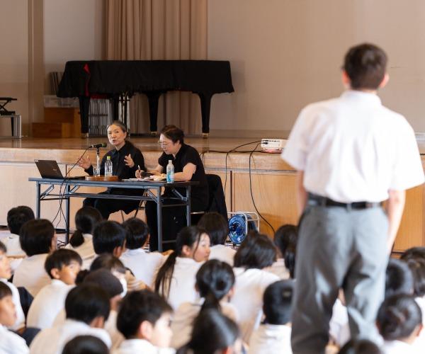 オイルペインティング作品を主としていた活動初期から、「人や国の境、様々な意味の壁やバリアといったものを作品を通して越えていきたいと常々思っていた」と語ったキムスージャ氏。母のためにベッドカバーでボッタリ(韓国の伝統的な風呂敷包み)を縫っていた時、針を柔らかい布に刺した瞬間に、電気ショックを浴びたような衝撃を受けたと、自身のアートが生まれた瞬間について話しました。映し出される鮮やかな布の作品や光のインスタレーションの映像と相まって、生徒たちの心に響き、次々と問いかけの手があがりました。ボッタリの刺繍には模様によって愛や子孫繁栄の意味があることなど、作品を通じてアジア文化への興味を深めた生徒たち。最後に生徒代表からお礼と感想が伝えられ、全校生徒から温かい拍手が送られました。