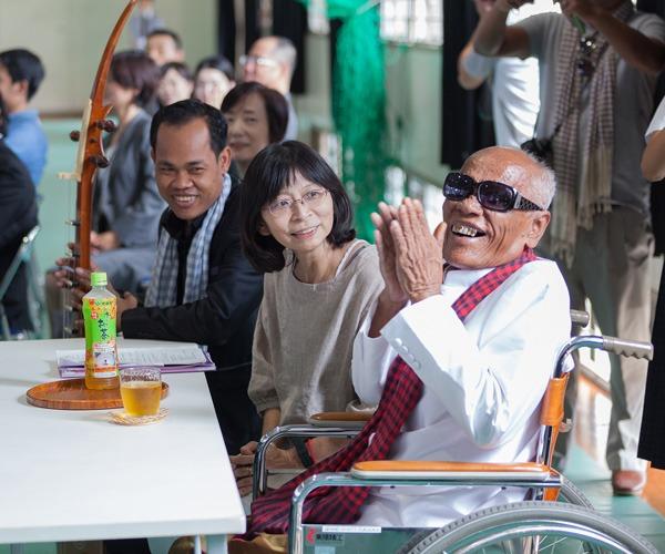 寺内氏からカンボジアの歴史と音楽に関する説明を受けた後、コン・ナイ氏が受賞の喜びの歌や『リアムケー』などを演奏しました。そのお礼に生徒たちは全員で『ふるさと』を合唱。見事なコーラスをコン・ナイ氏に贈りました。