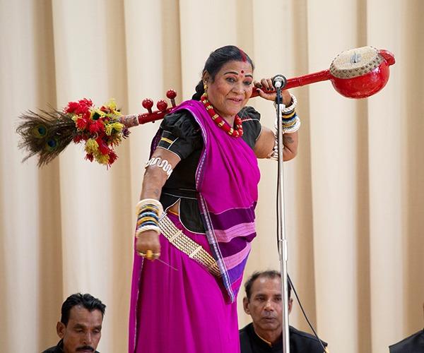 パンダワーニー伴奏者によるリズミカルな音楽で幕を開けた音楽交流会。まず、案内役の村山和之氏がパンダワーニーとティージャン・バーイー氏を紹介し披露される物語を解説。「マハーバーラタ」の物語を歌うパンダワーニーのパフォーマンスが始まりました。当初、児童たちは力強い歌声に圧倒された様子でしたが、次第にティージャン・バーイー氏の表情豊かな演技に引き込まれていき熱心にステージを見つめていました。