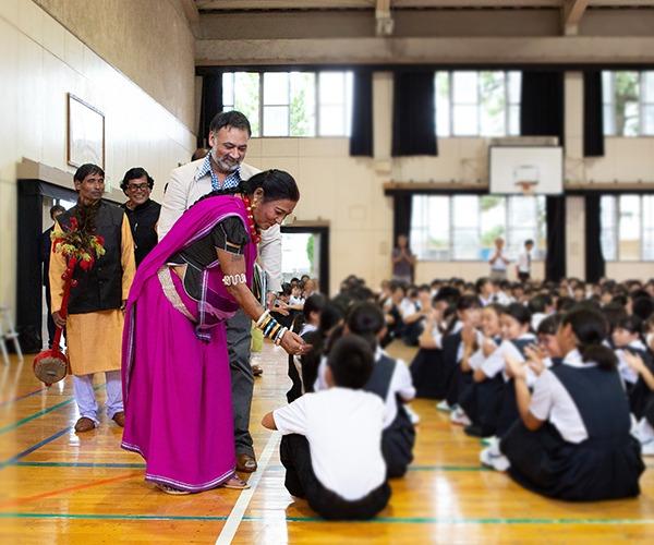 全校生徒から大きな拍手とヒンディー語による歓迎の言葉で迎えられたティージャン・バーイー氏一行。最初に村山氏がティージャン・バーイー氏と「マハーバーラタ」を紹介しステージはスタート。演奏は次第に熱を帯び、生徒たちは感動の眼差しで動きを見つめ歌声に聞き入っていました。