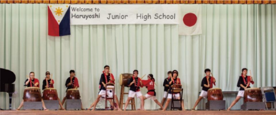 全生徒からフィリピノ語で挨拶を受けたランドルフ・ダビッド氏。太鼓部の歓迎演奏を鑑賞した後、5名の生徒代表と壇上に上り「これからの国際社会で生きるために何が必要か」というテーマでディスカッションを行いました。生徒は英語を交えながら、日本とフィリピンの関係やフィリピンの子ども達がどんな夢を描いているかなどについて質問を投げかけました。ダビッド氏は互いの国の歴史や過去の経緯を理解した上で新しい関係を築いていくこと、自国の子どもたちの現状、さらに他国の文化を学ぶことの大切さを語りました。