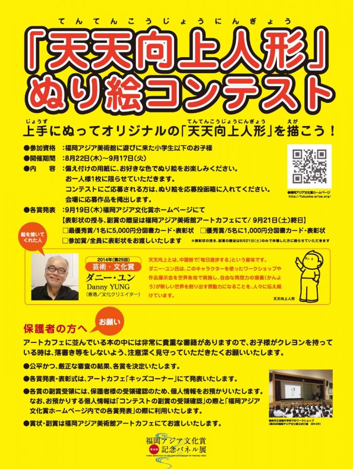 福岡アジア美術館 アートカフェで開催する「福岡アジア文化賞 第30回記念パネル展」にて、「天天向上人形」ぬり絵コンテストを開催します。 各賞の発表は、9月19日(木)に福岡アジア文化賞ホームページにて。表彰状の授与、副賞の贈呈は福岡アジア美術館アートカフェにて9月21日(土)終日行います。 詳しくは、下記ご案内をお読みください。皆様のご参加をお待ちしております! 「天天向上人形」ぬり絵コンテスト(PDF, 755.6KB)