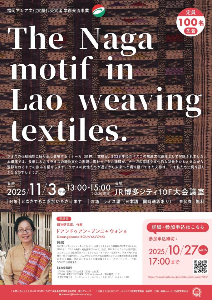 2005年(第16回)福岡アジア文化賞 芸術・文化賞受賞者 ドアンドゥアン・ブンニャウォン氏を福岡にお招きし、「ラオスの織物に宿る神話~ナーガ文様の意味と未来(The Naga motif in Lao weaving textiles.)」と題し、講演を行います。同時通訳あり。ぜひご参加ください!