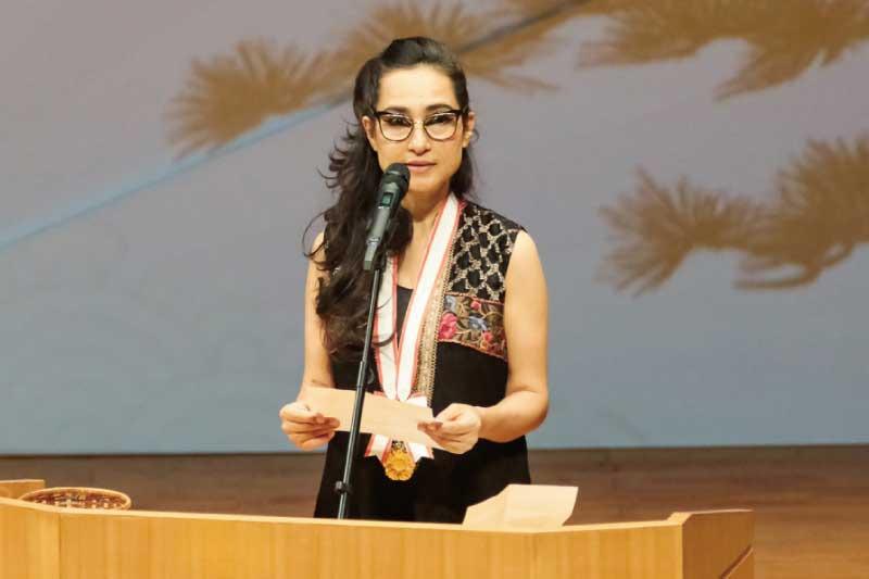 その後、選考経過報告、受賞者の功績紹介、賞状・メダル授与と続き、スピーチ・インタビューでは、タイモン・スクリーチ氏は「福岡は過去何世紀にも渡って国際交流の地として知られており、福岡の人々からのこの賞を受賞できることは格別の光栄である。」と、シャジア・シカンダー氏は「この賞を、アジアの知識、歴史、革新性を認識し称える、若い世代に捧げます。」と、林英哲氏は「世の風が激しく吹きすさぶ現代であればこそ、人々を前向きにさせる音や表現は必要で、そのような表現を目指して今後も歩んで行こうと思う。」と、熱く語りました。