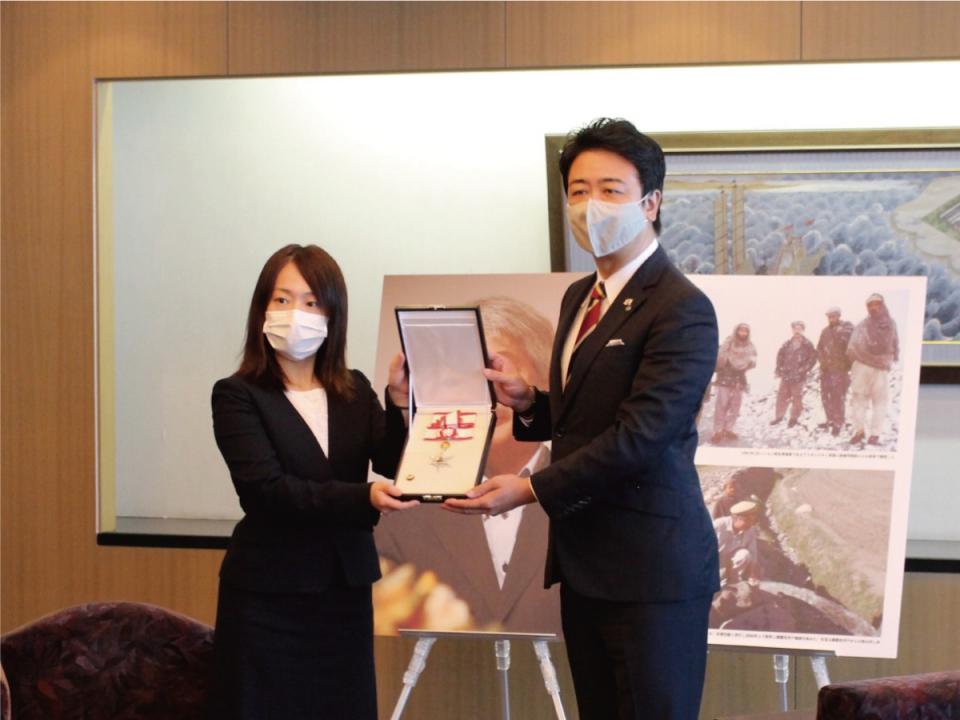令和2年9月14日(月),2013年(第24回)福岡アジア文化賞大賞受賞者である中村哲氏(令和元年12月4日逝去)に対し,福岡市名誉市民の称号が贈呈されました。贈呈式は福岡市役所で執り行われ,中村哲氏のご遺族が出席されました。